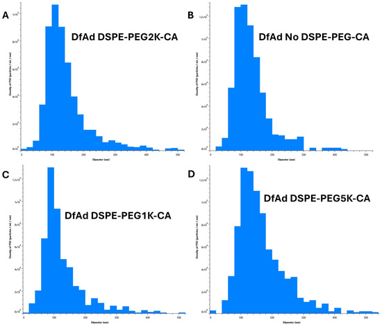 Characterization of various DfAd formulations using NTA with stirring. (Table 3) The effect of PEG lipid composition and length on particle size using NTA on DfAd with stirring. Fold change refers to the relative change in mean diameter of the DfAd sample of interest compared with the average diameter of DfAd with DSPE-PEG2000-CA. (A) Graphical size distribution of DfAd particles formulated with DSPE-PEG2K-CA. (B) Graphical size distribution of DfAd particles formulated without DSPE-PEG-CA. (C) Graphical size distribution of DfAd particles formulated with DSPE-PEG1K-CA. (D) Graphical size distribution of DfAd particles formulated with DSPE-PEG5K-CA.