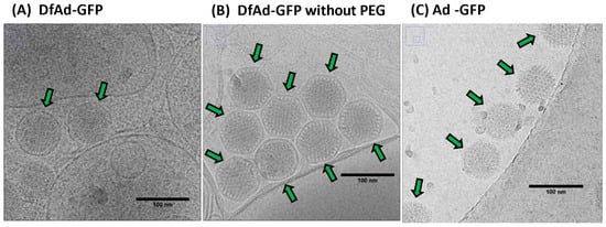 The cryo-TEM images in Figure 7 show that the Ad and the liposome coating can be distinguished. In Figure 7A,B, the liposome encapsulation appears to be of thin dark layers around darkened spheres of 70–80 nm in diameter. The diameter of the encapsulated dark spheres is around 80–90 nm. Figure 7A shows two separated DfAd nanoparticles marked with green arrows. Figure 7B shows eight DfAd nanoparticles bunched together, each marked with a green arrow. Liposome-encapsulated adenovirus in both Figure 7A,B are tightly enveloped with about 5–10 nm of space separating the surface of the virus from the lipid bilayer. While removing DSPE-PEG2000-CA did not change the size of the encapsulated virus, the DfAd without DSPE-PEG-CA appeared more bunched together, and the liposomes appeared to be more hexagonal than spherical, compared with the DfAd with DSPE-PEG2000-CA. In Figure 7C, the viruses are shown to be darkened spheres of roughly 70–80 nm in diameter. Five viral particles are each marked with green arrows. In Supplementary Figure S4A, there are two DfAd that are encapsulated together in one larger liposome. Supplementary Figure S4B shows DfAd without DSPE-PEG-CA, with similar shaped liposomes as in Figure 7B, except that the nanoparticles in Supplementary Figure S4B are less bunched together.