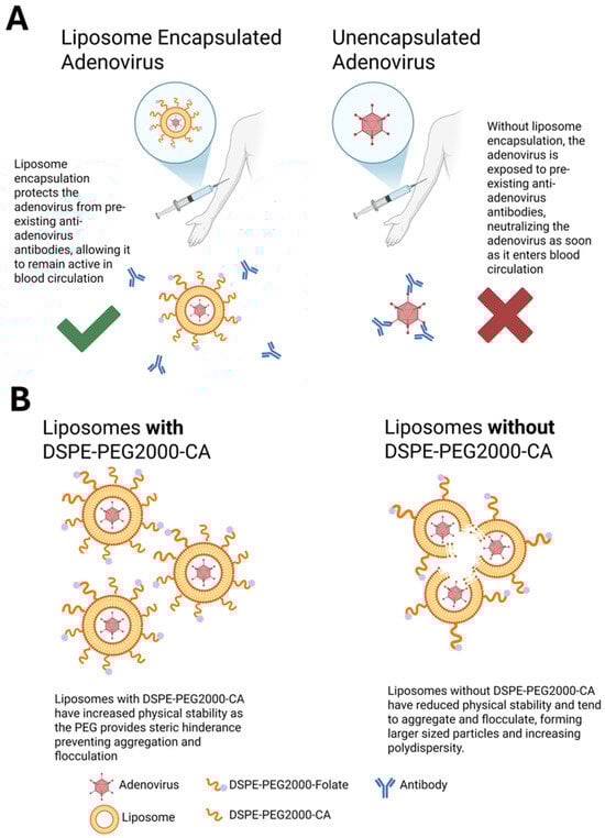 Summary schematic of PEGylated liposome-encapsulated Ad. (A) Schematic of liposome protecting encapsulated Ad from neutralizing antibodies in circulation. Without encapsulation, Ad is exposed to surrounding neutralizing antibodies in the blood and is immediately neutralized. (B) Schematic of DSPE-PEG2000-CA’s role in increasing stability of DfAd, resulting in smaller, more uniform nanoparticles. Removal of DSPE-PEG2000-CA results in reduced stability, causing aggregation between nanoparticles and increasing their size. (A) was created in BioRender. Phung, A. (2025) https://BioRender.com/hs8e533. Accessed on 26 May 2025. (B) was also created in BioRender. Phung, A. (2025) https://BioRender.com/j53c141. Accessed on 26 May 2025.