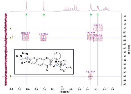 The NMR spectra (see Supplementary Material) of the newly synthesised compounds 5a–5c showed characteristic signals for the flavone scaffold and the glycosyl moieties. Additionally, signals of the triazole proton (δH 8.62–7.88, s) and carbons (δC 143.1–141.6 and 125.2–123.8) were observed by NMR. The placement of the triazole ring in these compounds was confirmed by the heteronuclear multiple bond correlation (HMBC) spectra. Special nomenclature for this correlation attributions’ were used. These spectra showed a correlation between the proton signals A (-C=CH-triazole) and C (-O-CH2-triazole) with carbon B signal (-C=CH-triazole), and carbon B with the C-7 signal. The same was observed for the other triazole ring with two bridges of correlations between the proton signals D and F with carbon E signal, and proton D signal with C-3 signal (Figure 1). These correlations were observed for the three di-glycosyl flavones.