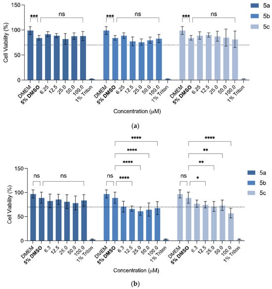 The presence of 5% DMSO had significant effect on cell viability (CV) of the L929 cell line (p = 0.0003, Figure 2). Considering the cytotoxicity of the compounds in this cell line, some significant changes in the CV percentages were observed; however, none of them decreased the CV below 70% (which is the safety threshold, according to the ISO 10993-5:2009) (Figure 2a). None of the compounds showed significant viability changes, proving that their use is safe up to 100 µM (5a: p > 0.9999; 5b: p = 0.4695; 5c: p = 0.2876).