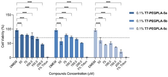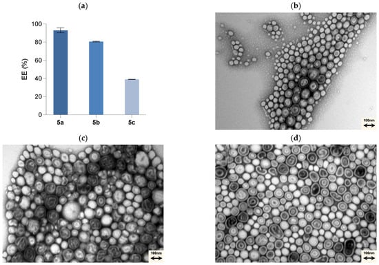Regarding the loaded PMs, the biggest increase in size was with the 0.1 mol% T7-PEGPLA-5a formulation, from a mean of 122.7 to 184.4 nm (p < 0.0001). The 0.1 mol% T7-PEGPLA-5b formulation had a mean of 161.6 nm (p = 0.0010), whereas the 0.1 mol% T7-PEGPLA-5c formulation had a mean of 153.2 nm (p = 0.0030). These differences in size can be correlated to the entrapment efficiency (Figure 3a) of each formulation, given that the empty formulations (0 mol% and 0.1 mol%) show similar mean diameters and PDIs. Compound 5a had the biggest entrapment efficacy (93 ± 2.73%), followed by 5b (80 ± 0.49%), and finally 5c (39 ± 0.12%). Higher EE% seems to increase more the mean diameter than a lower EE% formulation.