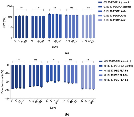 In a statistical analysis of the mean diameter, the empty PMs’ formulations (0 mol% and 0.1 mol%) did not show any statistical difference (p = 0.9993), proving that the presence of the T7-PEGPLA does not alter the morphology of the particle.