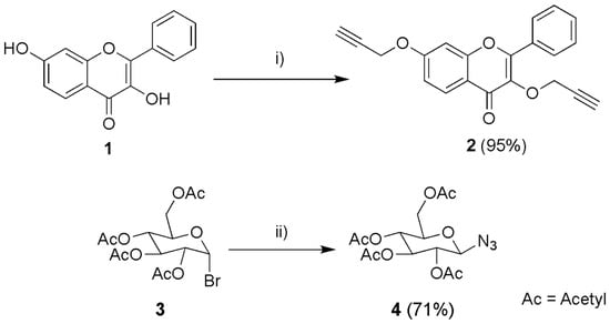 Synthesis of 3,7-(prop-2-yn-yloxy) flavone (2) and 2,3,4,6 tetra-O-Acetyl-β-D-glucopyranosyl azide (4). (i) Propargyl bromide, Tetrabutylammonium hydrogen sulphate (TBAHS), Cs2CO3, acetone, 60 °C, 8 days; (ii) NaN3, acetone:water, room temperature, 4 h.
