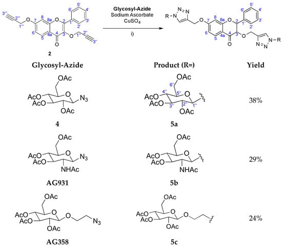 Compounds 5a–c were synthesised by CuAAC. The reactions involved the previously formed flavone (2) together with three similar glycosyl-azide substrates: 2,3,4-tetra-O-acetyl-β-glucopyranosyl azide (4), commercial 2-acetamido-3,4,6-tetra-O-acetyl-2-deoxy-β-D-glucopyranosyl (AG931), and commercial 2-azidoethyl 2,3,4,6-tetra-O-acetyl-β-D-glucopyranosyl (AG358). These reactions were performed in the presence of copper sulphate (CuSO4) and sodium ascorbate in a non-homogeneous mixture of water and THF (1:4) at room temperature (Scheme 2).
