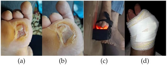 Wound treatment protocol using latex biomembrane and LED phototherapy. (a) Pretreatment presentation of the diabetic ulcer following aseptic cleansing with 0.9% saline solution. (b) Custom-sized natural latex biomembrane being applied to cover the wound bed. (c) Combined therapeutic intervention showing simultaneous biomembrane application and LED phototherapy (635–640 nm wavelength) administration. (d) Completed wound dressing with biomembrane as primary layer, secured by secondary gauze and bandage coverage [35]. Reproduced with permission from Thamis Fernandes Santana, Interdisciplinaridade no contexto das doenças dos pés no diabetes; published by EDUERN, 2021.