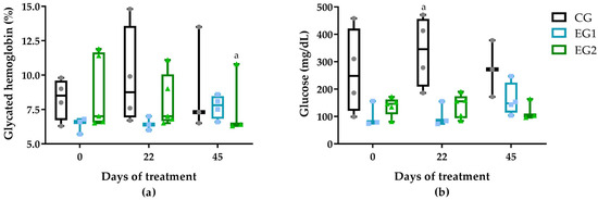 Glycated hemoglobin values (%) (a) and blood glucose concentration (b) among the treatment groups: standard therapy (CG), natural latex biomembrane with LED irradiation (EG1), and curcumin-loaded liposome biomembrane with LED irradiation (EG2) at days 0, 22, and 45. Data represent mean values ± standard deviation (n = 5 per group). Statistical significance (p ≤ 0.05) was determined by the Kruskal–Wallis test with post-hoc Dunn for more than two independent samples and Friedman test with post-hoc Dunn for related samples. Superscript letters indicate significant differences compared to day 0.