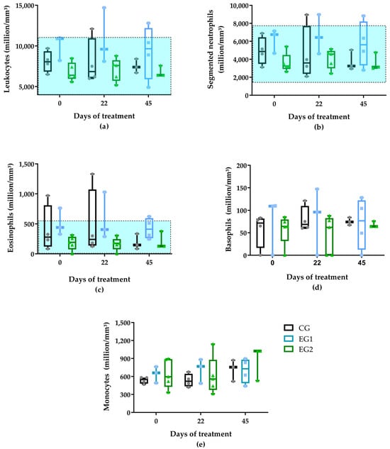 Leukogram cell counts: (a) leukocytes, (b) segmented neutrophils, (c) eosinophils, (d) basophils, and (e) monocytes among the treatment groups: standard therapy (CG), natural latex biomembrane with LED irradiation (EG1), and curcumin-loaded liposome biomembrane with LED irradiation (EG2) at days 0, 22, and 45. Data represent mean values ± standard deviation (n = 5 per group). Statistical significance (p ≤ 0.05) was determined by the Kruskal–Wallis test with post-hoc Dunn for more than two independent samples and Friedman test with post-hoc Dunn for related samples. The area of the rectangle represents the reference range.