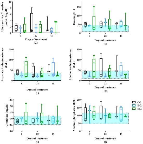 Concentrations of (a) ultrasensitive C-reactive protein, (b) urea, (c) aspartate aminotransferase, (d) alanine aminotransferase, (e) creatinine, and (f) alkaline phosphatase of the participants among the experimental groups: standard therapy (CG), natural latex biomembrane with LED irradiation (EG1), and curcumin-loaded liposome biomembrane with LED irradiation (EG2) at days 0, 22, and 45. Data represent mean values ± standard deviation (n = 5 per group). Statistical significance (p ≤ 0.05) was determined by the Kruskal–Wallis test with post-hoc Dunn for more than two independent samples and Friedman test with post-hoc Dunn for related samples. The area of the rectangle represents the reference range.