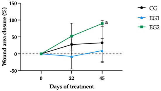 Temporal progression of wound closure (%) across experimental groups: standard therapy (CG), natural latex biomembrane with LED irradiation (EG1), and curcumin-loaded liposome biomembrane with LED irradiation (EG2) at days 0, 22, and 45. Data represent mean values ± standard deviation (n = 5 per group). Statistical significance (p ≤ 0.05) was determined by the Kruskal–Wallis test with post-hoc Dunn for more than two independent samples and Friedman test with post-hoc Dunn for related samples. Superscript letters indicate significant differences compared to day 0. The dashed reference line indicates baseline wound size (0% closure).