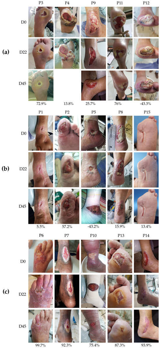 Photographic analysis revealed notable variability in wound healing responses across treatment groups. In EG1, participant P5 exhibited a 43% increase in wound area (Figure 7b), while P1 showed minimal improvement (5.5% closure). Other EG1 participants demonstrated intermediate healing rates: P2 (57.2%), P8 (15.9%), and P15 (13.4%).