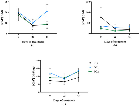 Oxidative stress assessment through CM• quantification revealed distinct temporal patterns across treatment groups and biological samples. In venous blood, while no statistically significant intergroup differences emerged, both CG and EG2 demonstrated progressive CM• concentration decreases throughout treatment, with EG2 showing a statistically significant reduction between baseline and day 22. EG1 showed a biphasic response, with an initial reduction followed by terminal increase at D45 (Figure 8a).