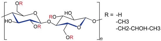 As previously mentioned, hydroxypropyl methylcellulose belongs to a group of semi-synthetic cellulose derivatives, whose hydroxyl groups have been partly substituted by ether-linked methoxy and hydroxypropyl side groups []. This addition disrupts cellulose’s crystalline structure, contributing to HPMC’s hydrophilic nature. Its unique character relies on the ability to hydrate, swell, and form a gel upon heating at 75–90 °C while being soluble in cold water [,].