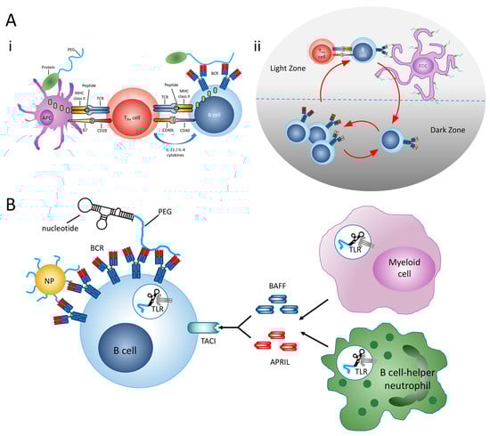Immune response to PEG. (A). Thymus-dependent immune response against PEG. (i) Antigen-presenting cells take up pegylated proteins and present digested peptide fragments to activate specific TFH cells (ii) Anti-PEG B cells undergo rapid proliferation and somatic hypermutation in the dark zone of a germinal center. (B) Thymus-independent immune response against PEG []. Copyright © 2021 American Chemical Society.