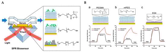 (A). Scheme illustrator of the SPR technique of anti-PEG Abs detection. (B). The gold chip surfaces were modified by a PEGMA polymer brush (a), mPEG (b), or EG4 SAM (c) and tested by both the negative control (black) and anti-PEG (red) serum samples []. Copyright © 2017 American Chemical Society.
