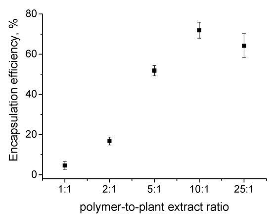 The loading of Inula helenium in PMPP-PLA PMs was performed as the plant extract was added to the micellar aqueous dispersion, giving a polymer-to-plant extract mass ratio in the range of 1:1 to 25:1. The mixtures were sonicated for 60 min at 60 °C to ensure maximum solubilization then they were filtered to collect the insoluble plant extract fraction. The AL and IAL from the filter fractions were quantified by HPLC and used to determine the EE. As evident from Figure 3, the effect of the polymer-to-plant extract ratio on EE was noticeable. At lower ratios (1:1 and 2:1) a very low EE was achieved (below 20%). Increasing the polymer-to-plant extract ratio led to an increase in EE and an optimal value of 72% was reached at the 10:1 ratio. A further increase in the polymer-to-plant extract ratio (25:1) did not influence the value of EE. We could suggest that at lower ratios an optimum loading capacity of PMPP-PLA PMs is reached, limiting the adsorption of more Al and IAL molecules. Therefore, the drug loading content (DLC) was also calculated as the variations in this parameter as a function of the polymer-to-plant extract ratio are given in Figure S3. Indeed, in the range of ratios from 1:1 to 5:1 the DLC has the highest values—between 4 and 4.9%. At higher ratios (10:1 and 25:1) the DLC value decreases, giving rise to enhanced EE.