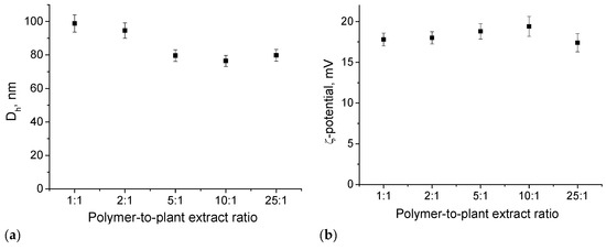 DLS and ELS were used to follow the size and ζ potential of PMPP-PLA PMs after loading. The particle size variations with the polymer-to-plant extract ratio are given in Figure 4a. At low polymer-to-plant extract ratios (1:1 and 2:1) a slight increase in size (~10%) of loaded PMs was detected, while the Dh of particles at higher ratios (>5:1) was comparable to those of empty micelles. The increased PMs size could be attributed to the optimum DLC of the plant extract at lower ratios. A similar behavior has been observed for other polymeric micellar systems used as drug delivery vehicles [42]. The increased incorporation of AL and IAL molecules in the hydrophobic core of PMs at lower ratios leads to low colloidal stability of the systems. After 1 month, a precipitation was observed for particles loaded at 1:1 ratio (see Figure S4). For the rest of the loaded PMs no changes in the Dh were observed, showing their good colloidal stability. The ζ potential of micelles remains unchanged after loading (Figure 4b).