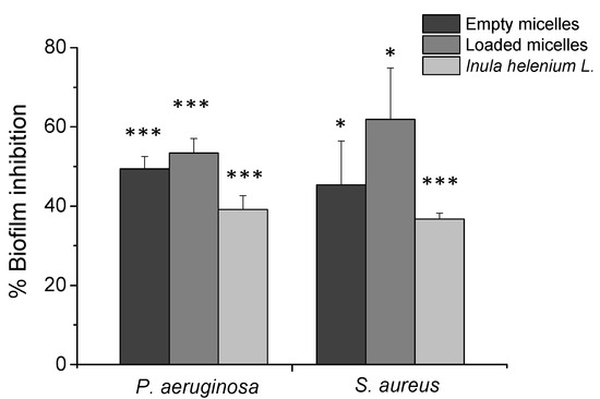 The effectiveness of empty and loaded PMPP-PLA PMs was investigated against biofilms of two strains, P. aeruginosa and S. aureus. Data analysis was performed after 24 h of treatment using crystal violet staining, and the concentration-dependent effects of the treated biofilms were calculated as a percentage relative to the untreated control samples for each strain (Figure 7). The results demonstrate the increased activity of PMs after loading against biofilms compared to empty micelles. The exfoliating effect of the loaded PMPP-PLA PMs exceeded 50% inhibited biofilm biomass for both treated strains, with higher values observed for S. aureus at 61.87%. The high efficiency values suggest that the loaded PMs probably facilitate targeted delivery of the encapsulated plant extract into the interior of pre-formed biofilms, regardless of the protective nature of the exopolysaccharide matrix. Empty PMPP-PLA micelles and Inula helenium root extract also exhibited effectiveness, with statistically significant inhibition rates of 49.4% and 39.1% for P. aeruginosa, and 45.3% and 36.7% for S. aureus, respectively.