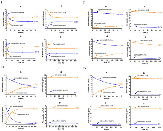 We investigated the equilibrium dynamics between the lactone (ring-closed) and hydroxyacid (ring-opened) forms of simvastatin and atorvastatin in buffered solutions at various pH values, as shown in Figure 2 and Table 1. The conversion was monitored over time, starting from either the lactone or hydroxyacid form for each statin. In the case of simvastatin, the equilibrium was studied starting from the lactone form (Figure 2(IA–IVA)) or hydroxyacid form (Figure 2(IB–IVB)). Likewise, for atorvastatin, the conversion was examined starting from the lactone form (Figure 2(IC–IVC)) or from the hydroxyacid form (Figure 2(ID–IVD)).