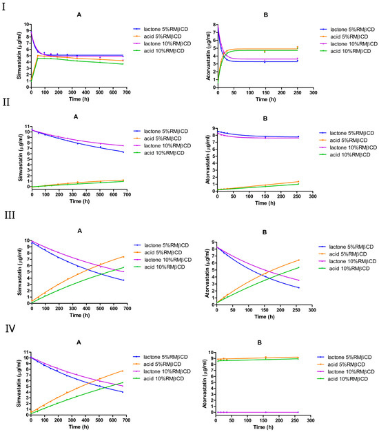 The equilibrium between the lactone and hydroxyacid forms of simvastatin and atorvastatin in the presence of HPβCD at pH 2 (I), pH 4.5 (II), pH 7 (III), and pH 9.5 (IV). A is simvastatin and B is atorvastatin.