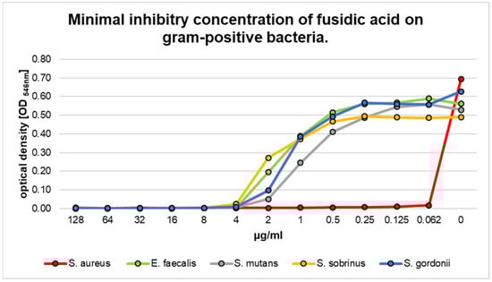 The minimum inhibitory concentration (MIC) values of fusidic acid for the investigated Gram-positive species are summarized in Figure 2. The optical density (OD) was used to illustrate the inhibitory effects. The MIC is defined as lowest drug concentration at which visible growth is inhibited (OD = 0). For the Gram-positive species S. mutans, S. sobrinus, and E. faecalis, an MIC of 4 μg/mL was evaluated. The highest susceptibility toward fusidic acid was detected for S. aureus. For this species, an MIC of <0.062 μg/mL was determined (red graph, Figure 1), which was significantly different from all other Gram-positive bacteria (p < 0.01).