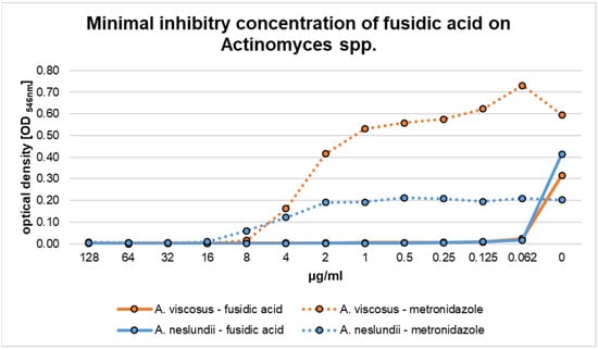 The results regarding the filamentous Gram-positive species A. viscosus and A. neslundii are summarized in Figure 3. Both species presented a high susceptibility toward fusidic acid. For both bacteria, an MIC of 0.062 µg/mL was obtained. In the case of metronidazole, higher MIC values were detected. In detail, treatment with metronidazole resulted in minimal inhibitory concentrations of 8 µg/mL and 16 μg/mL for A. viscosus and A. neslundii, respectively (Figure 2). There was a significant difference between both species when compared to the susceptibility toward fusidic acid (p < 0.01).