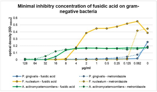 Among all tested Gram-negative species, P. gingivalis showed the highest susceptibility. It was found that minimal fusidic acid concentrations of 0.062 µg/mL prevented visible bacterial growth. This could be due to the fact that P. gingivalis belongs to the genus Bacteroides, which are described as being sensitive to fusidic acid [].