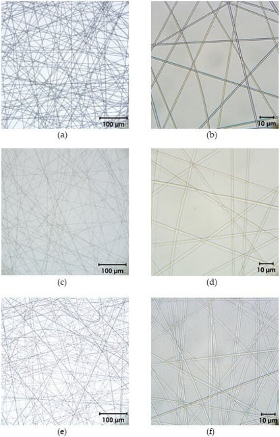Microscopic characterization of fusidic acid-loaded electrospun fiber fleeces: (a,b) Fleeces without fusidic acid; (c,d) electrospun fiber fleeces with 10 wt% fusidic acid; (e,f) fiber fleeces with 20 wt% fusidic acid. Pictures are presented at magnifications of 20× (left) and 100× (right).