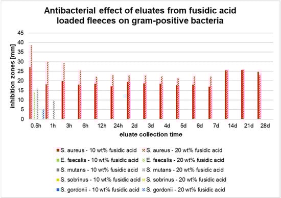 The eluates obtained from the electrospun polylactide fleeces loaded with fusidic acid in concentrations of 10 and 20 wt% presented only minor effects on most of the tested Gram-positive cocci species, except S. aureus (Figure 6) showed a significant reduction. Inhibition zones were detected for S. gordonii, S. mutans, and E. faecalis only for the eluates obtained from the 20 wt% fleeces. In detail, inhibition zones for S. gordonii and E. faecalis were detected only for the eluates collected after 0.5 h of incubation. S. mutans additionally showed an inhibition zone after one hour of incubation. All of the other eluates collected from either the 10 or 20 wt% fleeces failed to induce any inhibition zones (Figure 6). No inhibition zones were found for the Gram-positive species S. sobrinus.