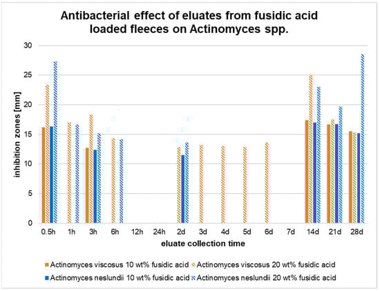 The collected eluates also induced major inhibition zones for both Actinomyces spp. (Figure 7). Samples obtained from the 10 wt% fleeces caused inhibition zones for A. viscosus after 0.5 h, 3 h, 14 d, 21 d, and 28 d of incubation. The eluates collected from the 20 wt% fleeces additionally induced inhibition zones after 1 h and 6 h as well as between days 2 and 6.