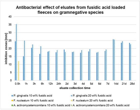 Similar to the oral Gram-positive cocci species, almost no inhibitory effects were observed for Gram-negative F. nucelatum and A. actinomycetemcomitans (Figure 8). Only eluates collected from the 20 wt% fleeces after 0.5 h of incubation induced inhibition zones for F. nucleatum. In the case of A. actinomycetemcomitans, none of the collected eluates showed any inhibitory effect in the agar diffusion assays.