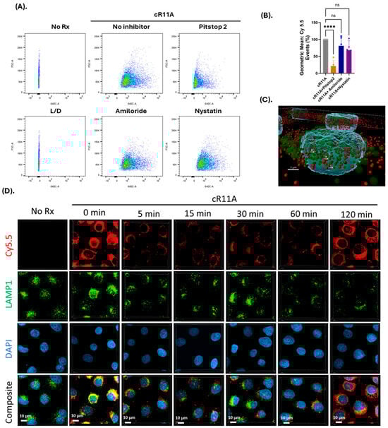 Mechanism of transduction of cR11A studies. (A). FACS analysis of cR11A uptake by HBECs with or without endocytosis inhibitors. Pitstop2 significantly reduced cR11A uptake, while Amiloride and Nystatin had no effect. (B). Quantification confirmed a significant reduction in cR11A uptake with Pitstop2 (p < 0.001), whereas Amiloride and Nystatin showed no significant changes (ns) (**** p < 0.0001). (C). Three-dimensional visualization of colocalization of cR11A and LAMP1. Arrow A: complete co-localization, B: partial co-localization, C: no co-localization. Red: cR11A-Cy5.5, green: LAMP1, blue: DAPI-stained nuclei. Scale bar: 3 µm. (D). Confocal microscopy revealed the colocalization of cR11A with lysosomes at 0 min, indicating initial lysosomal uptake. By 120 min, cR11A localized in the cytosol with minimal lysosomal overlap, demonstrating lysosomal escape. Red: cR11A; green: LAMP1; blue: DAPI. Scale bars: 10 μM.