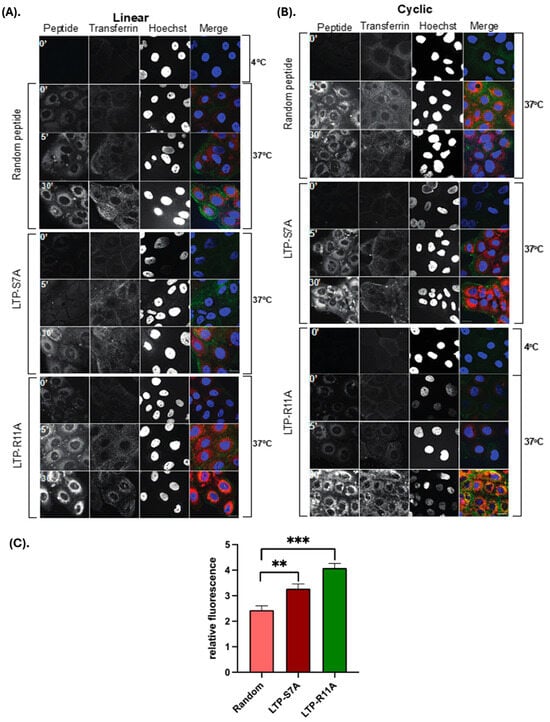 Endocytosis studies: In order to investigate the mechanism of cell entry, human bronchial epithelial cells (HBECs) were serum-starved overnight and subsequently treated with specific endocytic pathway inhibitors. The cells were incubated with Pitstop2 (15 μM to inhibit clathrin-mediated endocytosis), Amiloride (400 μM to inhibit macropinocytosis), or Nystatin (25 μM to inhibit caveolae-dependent endocytosis) for 1 h, followed by the addition of cR11A (1 μM) for 30 min. At the end of the incubation period, the cells were washed, trypsinized, harvested, and fixed with 2% PFA for 10 min at room temperature (RT), followed by a single wash and resuspension in PBS, and they were subjected to FACS analysis. In another set of experiments, HBECs were treated with cR11A at 10 μM for 30 min, followed by the removal of cR11A and replacement with media for varying durations (0, 5, 15, 30, 60, and 120 min). The cells were then fixed with 4% PFA, permeabilized with 1× permeabilization Buffer (eBioscience, San Diego, CA, USA; Cat# 00-8333-56), and blocked with 5% serum in PBS for 1 h at RT. The cells were incubated with anti-LAMP1 antibody (Abcam, Cambridge, UK; Cat# ab24170) overnight at 4 °C, washed, and stained with Alexa-Fluor-488-conjugated secondary antibody at RT for 1 h, mounted with DAPI, imaged in 3D using a Zeiss LSM 980 microscope, and analyzed with Imaris software (version 10.2.0) For the transferrin uptake assay, human Cystic Fibrosis bronchial epithelial cells (CFBE41o-) were grown on coverslips, and was serum starved for one hour at 37˚C. The cells were washed with cold PBS, incubated with Alexa-488-labeled transferrin on ice in a cold room, and incubated for an hour. At the end of incubation, Cy5.5-labeled random, linear or cyclic LTPs were added and transferred to 37˚C, and after each time point, the cells were washed and fixed in 4% PFA. The cells were stained with Hoechst and mounted for confocal imaging.