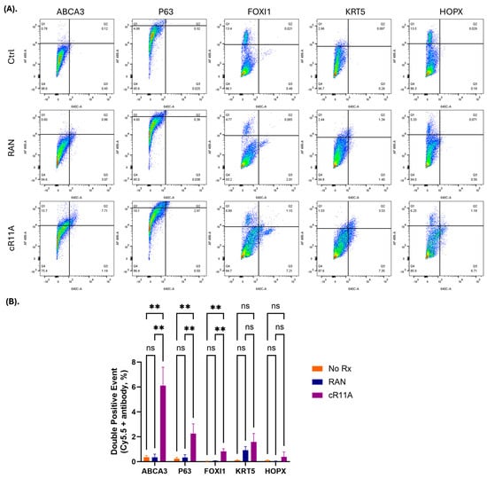 In vivo lung cell type targeting by cR11A. (A). FACS analysis of lung single cells isolated from wild-type mice injected with cR11A (1 mg/kg), RAN (1 mg/kg), or PBS. Staining with various lung cell markers revealed significantly increased uptake of cR11A in ABCA3+ ATII cells, followed by p63+ basal cells, and ionocytes compared to controls. (B). Quantification of double-positive events (cR11A-Cy5.5+ and marker+) showed significant uptake in ABCA3+ cells, p63+ cells and FOXI1+ cells in the cR11A-treated group. No significant differences (ns) were observed for KRT5 or HOPX+ cells. ** p < 0.01.