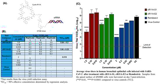 In vitro antiviral activity of cR11A-siRNA-S1, and cR11A-E2 against SARS-CoV-2 in human bronchial epithelial cell line. (A). Structural representation of the cR11A along with the DTME linker linking to the siRNA represented by double strands. (B). Table showing viral titers from human bronchial epithelial cells treated with the cR11A-siRNA conjugates for 24 h prior to infection with SARS-CoV-2 virus and the respective EC90 values, along with the EC90 value for remdesivir. (C). SARS-CoV-2 viral titers plotted for cR11A-S1, cR11A-E2, and remdesivir against the virus-only control. All infections and assays were carried out in triplicate.