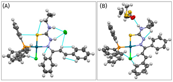Three-dimensional structural representations of the PdC3 complex obtained for the respective single crystals, ellipsoids of 50% thermal probability. (A) PdC3-Cl crystallized in acetonitrile/chloroform. (B) PdC3-DMSO crystallized in DMSO.