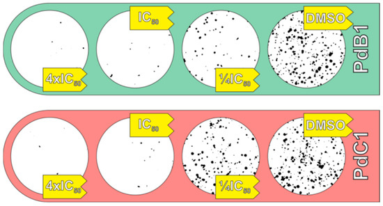 Images of the clonogenic assay carried out with A2780cis cells (600 cells/well); the cells were incubated in the presence of the complexes PdB1 and PdC1 at different concentrations for five days of treatment. Each circular area in the image corresponds to a 35 mm well of the 6-well plate.
