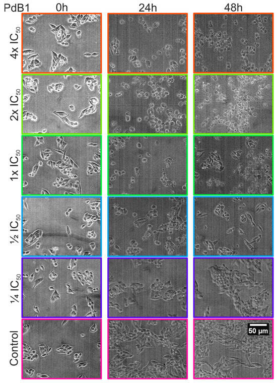 Fluorescence microscopy revealed a marked increase in red-fluorescing (non-viable) cells beginning at ½ × IC50, indicating early signs of cell death (Figure 7). This effect intensified with increasing concentrations of PdB1, suggesting a clear dose-dependent response.
