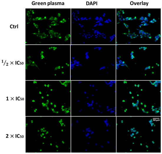 For morphological analysis by fluorescence with Green Plasma and DAPI, 1 × 104 cells/well of A2780cis were added to 96-well plates and incubated for 24 h. After this, the cells were treated with different concentrations of the compound and incubated for 48 h. Then the medium was removed and the cells were fixed with methanol for 5 min, and 50 μL of CellMasK Green Plasma membrane was added. After 5 min, 50 µL of DAPI was added and incubated at room temperature for a further 10 min. Images were taken using a fluorescence microscope (CELENA® S Logos Biosystems, Anyang-si, Republic of Korea) with the appropriate filters.