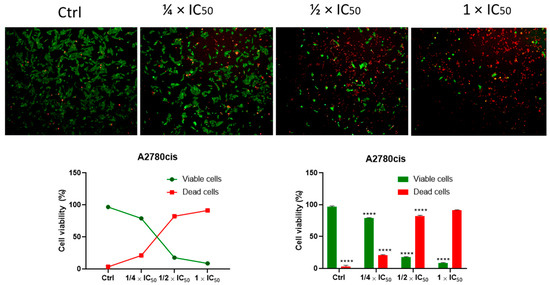1.0 × 104 A2780cis cells were added to each well in a 96-well plate. After 24 h, the cells were treated with different concentrations of the compound and incubated again for 48 h. Then 100 µL of the LIVE/DEAD® solution prepared as described by the manufacturer was added. The images were acquired using a fluorescence microscope (CELENA® S logos biosystems) with a 4× objective, carried out in triplicate. Live and dead cells were counted using ImageJ 1.53 software and the IC50 value was calculated using GraphPad Prism 8.0.2.