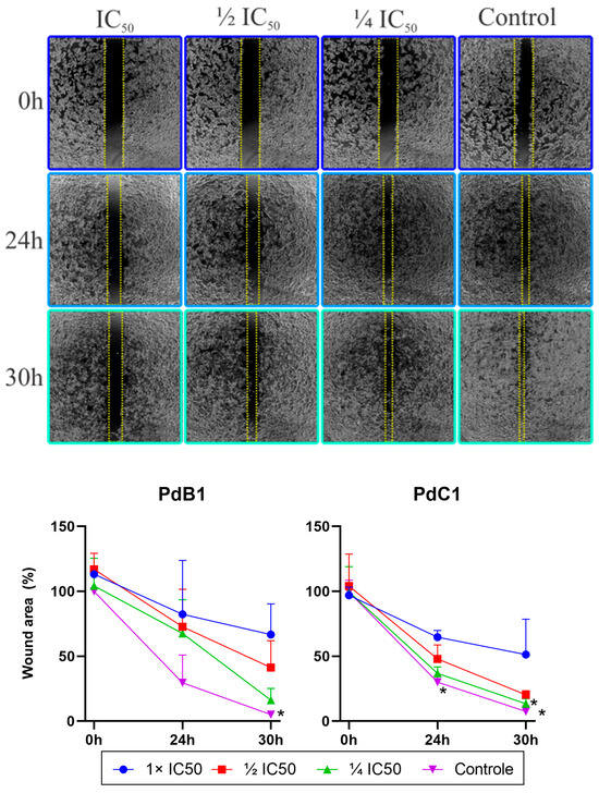 Microscopy images of the cell migration assay at times 0 h and 30 h after the addition of the compound PdB1 at different concentrations in the A2780cis cell line, and graphs of wound area (%) versus time for each of the compounds tested in IC50 fractions (* p < 0.05). Images obtained using a Nikon Eclipse TS 100 microscope with 4× zoom.