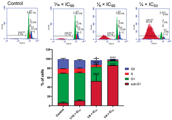 The results (Figure 9) showed a clear accumulation of cells in the sub-G1 phase after treatment. This phase is not part of the normal cell cycle, but reflects a population of cells with fragmented DNA, which is often associated with apoptosis. Thus, the increase in sub-G1 does not indicate classical cell cycle arrest, but instead the presence of dead or dying cells [42].