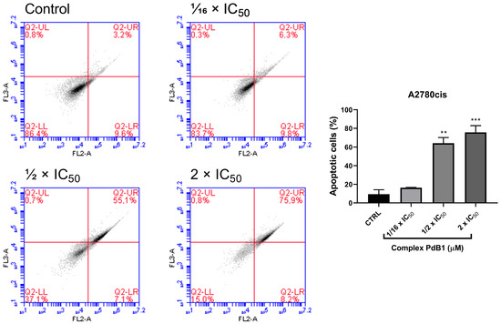 Apoptosis in A2780cis cells induced by the complexes was analyzed by flow cytometry; a PE-Annexin-V Apoptosis Detection kit (BD Biosciences) was employed. The cells (1 × 105 cells/well) were seeded in a 24-well plate. After incubation for 24 h, the cells were exposed to increasing concentrations of complex PdB1 for 24 h. After treatment, the cells were collected, centrifuged at 2000 rpm and 4 °C for 5 min, washed with ice-cold PBS, and resuspended in 150 µL of binding buffer. PE-Annexin V (2.5 µL) and 7ADD (2.5 µL) were added, which was followed by incubation in the dark at room temperature for 20 min. Then, the cells were centrifuged at 2000 rpm and 4 °C for 5 min, resuspended in 400 µL of binding buffer, and analyzed on an Accuri C6 (BD Biosciences) flow cytometer; 10,000 events were recorded. Fluorescence was quantified in triplicate with the Cell Quest software (BD Biosciences). Untreated cells were the negative control.