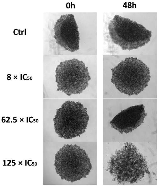 Brightfield microscopy images taken after 48 h of treatment showed continued spheroid growth at lower concentrations of PdB1, indicating limited cytotoxicity under these conditions (Figure 11). However, significant morphological changes were observed at a concentration of 25 µM. The spheroids showed a marked reduction in compaction and cohesion, with disrupted borders and visible disintegration of the spheroid structure. These features are indicative of loss of cell–cell adhesion and structural integrity, often associated with cell death within the spheroid core and periphery.