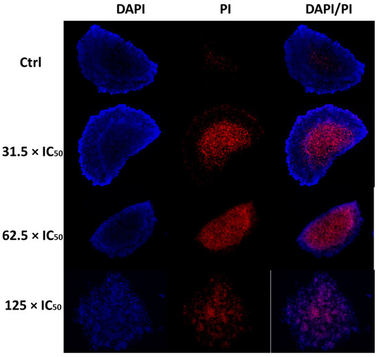 Fluorescence staining with DAPI and propidium iodide (PI) was used to further evaluate the extent and spatial distribution of cell death within A2780cis spheroids following treatment with the PdB1 complex (Figure 12). In this assay, DAPI selectively binds to DNA and labels the nuclei of all cells with blue fluorescence, while PI is membrane-impermeable and selectively labels the nuclei of dead cells with compromised membrane integrity with red fluorescence. The overlap of the two signals results in a purple hue, indicating nuclei of cells that have undergone cell death.