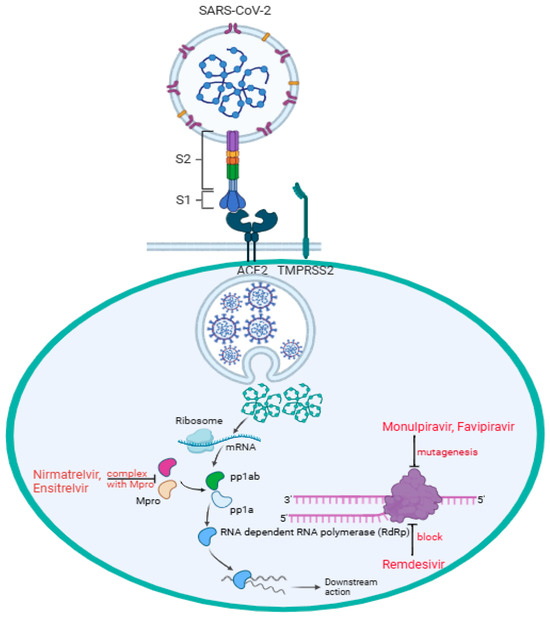 SARS-CoV-2 enters the target cell, particularly pneumocytes, through direct interaction between the cell surface ACE2 receptor and RBD B of the virus subunit S1, while the subunit S2 facilitates fusion between the host and the viral cell membranes. Followed by viral endocytosis, viral genomic mRNA is released into the host cell cytoplasm. Two-thirds of the mRNA, mainly at the 5′ end, encoded open reading frames (ORF1a and ORF1b), which are translated into two polypeptides, pp1a and pp1ab, and the remaining one-third of the mRNA, mainly at the 3′ end, serves as a template for transcription and replication. Nirmatrelvir and ensitrelvir form a complex with Mpro, stopping pp1a and pp1ab from being processed into functional non-structural proteins (nsps) 4–16 for viral replication. Remdesivir blocks RdRp (nsp12) by mimicking adenosine (A) nucleoside incorporated into the RNA strand, preventing the virus from replication. Through RdRp, molnupiravir mimicking cytidine (C) or uridine (U) nucleosides introduces multiple mutations during replication, causing lethal mutagenesis, and effectively stopping the downstream action. Through RdRp, favipiravir mimicking guanine (G) gets incorporated into RNA strands, inducing mutations, thus causing lethal mutagenesis.
