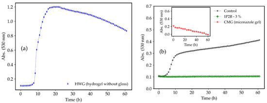 Growth curves of C. albicans in hydrogel without glass (HWG) (a), commercial miconazole gel (CMG), and borophosphate glass-loaded hydrogel (BGH) 3% (w/w) 1P2B (b). Control = C. albicans in RPMI 1640 medium only.