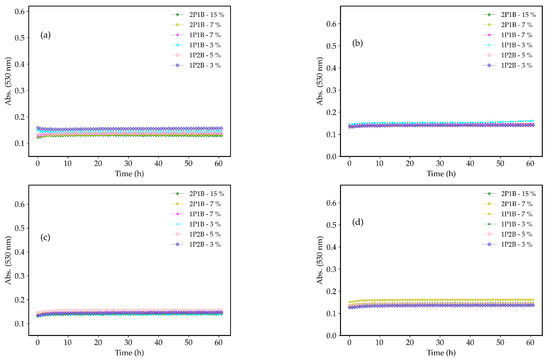 Growth curves of the (a) C. albicans, (b) C. tropicalis, (c) C. krusei, and (d) C. glabrata in the presence of the 1P2B (3% and 5% w/w), 1P1B (3% and 7% w/w), and 2P1B (7% and 15% w/w). Experiments performed in duplicate.