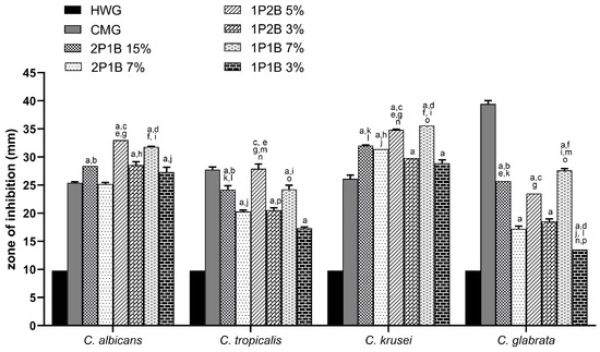 Mean zones of inhibition for Candida species cultures in association with borophosphate glass-loaded hydrogels (BGHs) 2P1B (15% and 7%),1P2B (5% and 3%), and 1P1B (7% and 3%); hydrogel without glass (HWG); and commercial miconazole gel (CMG). The symbols represent the statistically significant difference () among (a) miconazole 2% vs. all; (b) 2P1B 15% vs. 2P1B 7%; (c) 1P2B 5% vs. 1P2B 3%; (d) 1P1B 7% vs. 1P1B 3%; (e) 2P1B 15% vs. 1P2B 5%; (f) 2P1B 15% vs. 1P1B 7%; (g) 2P1B 7% vs. 1P2B 5%; (h) 2P1B 7% vs. 1P2B 3%; (i) 2P1B 7% vs. 1P1B 7%; (j) 2P1B 7% vs. 1P1B 3%; (k) 2P1B 15% vs. 1P2B 3%; (l) 2P1B 15% vs. 1P1B 3%; (m) 1P2B 5% vs. 1P1B 7%; (n) 1P2B 5% vs. 1P1B 3%; (o) 1P2B 3% vs. 1P1B 7%; and (p) 1P2B 3% vs. 1P1B 3%.