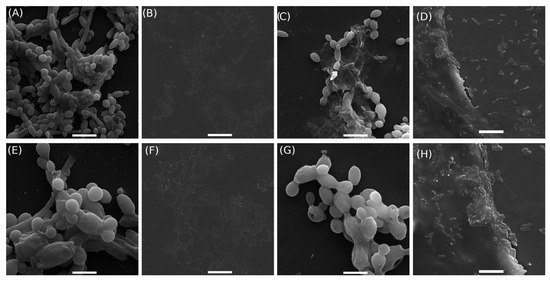 Scanning electron microscopy of cells: Candida Albicans cell culture RMPI (A,E); minimum inhibitory concentration (MIC, borophosphate glass concentration 2P1B 15% (Table 1)) (B,F); subminimum inhibitory concentrations (sub-MICs, borophosphate glass concentration 2P1B 4.6 mg/mL) (C,G); and negative control (hydrogel without glass (HWG)) (D,H). Images (A–D) scale bar: 10 m. Images (E–H) scale bar: 5 m.